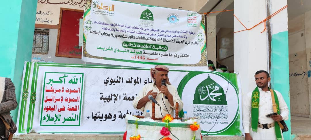 نظمت فروع مكاتب الهيئة العامة للزكاة والشباب والرياضة والصحة ومستشفى الأحد الريفي بمديرية وصاب السافل بمحافظة ذمار فعالية ثقافية إحياءً لذكرى المولد النبوي الشريف على صاحبه أزكى الصلاة وأتم التسليم.